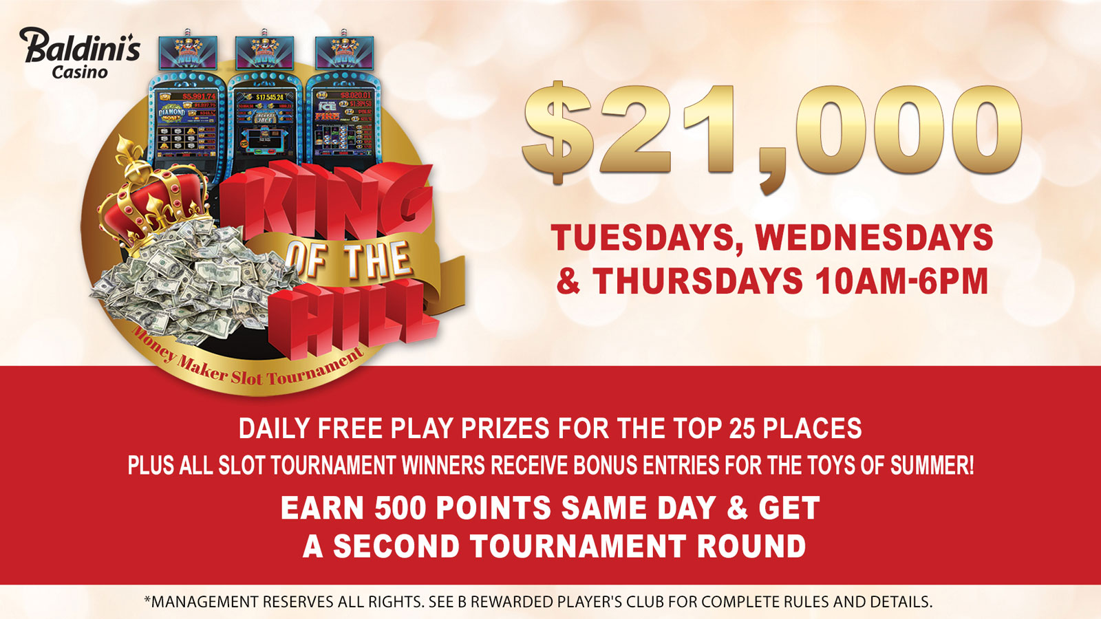 The King of the hill Slot Tournament returns to Baldini’s this March & April.